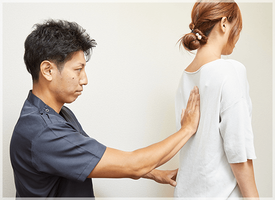 問診票とカウンセリングにてお聞きした情報をもとに、肩こりの根本の原因を突き止めるために検査をしていきます。どのような動作で痛みが出るのか、体のバランスはどうなっているのかなどを調べていきます。