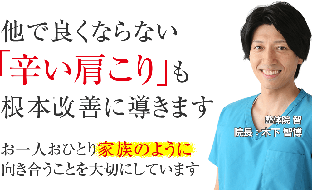 私は誰よりもあなたと向き合います。あなたのお悩みを私にお聞かせください。あなたの肩こりを改善するために全力で施術いたします。本気で肩こりを改善したいと思われる方は今すぐお電話ください。