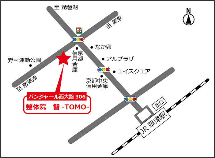 整体院 智-TOMO-は JR「草津駅」が最寄りになります。徒歩7分。