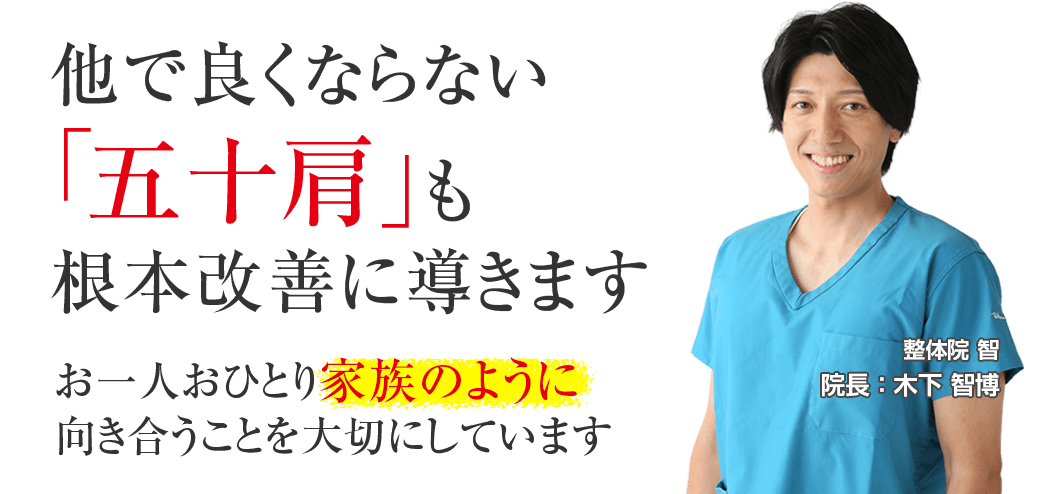 私は誰よりもあなたと向き合います。あなたのお悩みを私にお聞かせください。あなたの五十肩を改善するために全力で施術いたします。本気で五十肩を改善したいと思われる方は今すぐお電話ください。